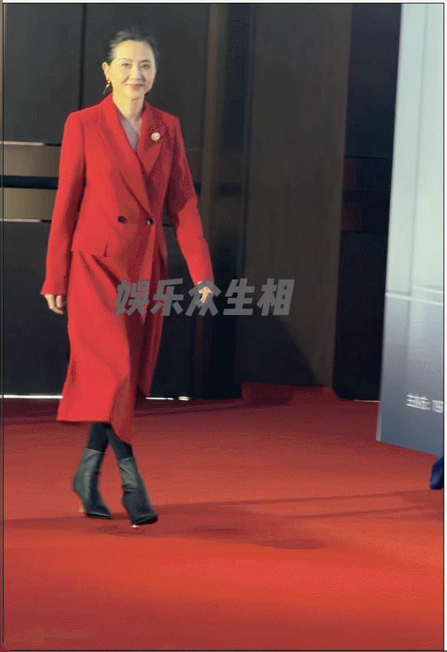 反观 59 岁的陶慧敏,造型没那么花哨,却直接赢麻了。一袭红色及膝毛呢大衣,配黑色高跟鞋,颜色鲜艳但不张扬,在冬天里看着就明媚。