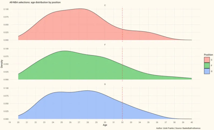 分析的下一步是检验最佳阵容评选是否因位置而异,从而将研究范围缩小至与戴维斯更具可比性的大个子球员。结果也确实显示出了差异:中锋的年龄分布曲线表明他们的巅峰期往往早于小个子后卫。
