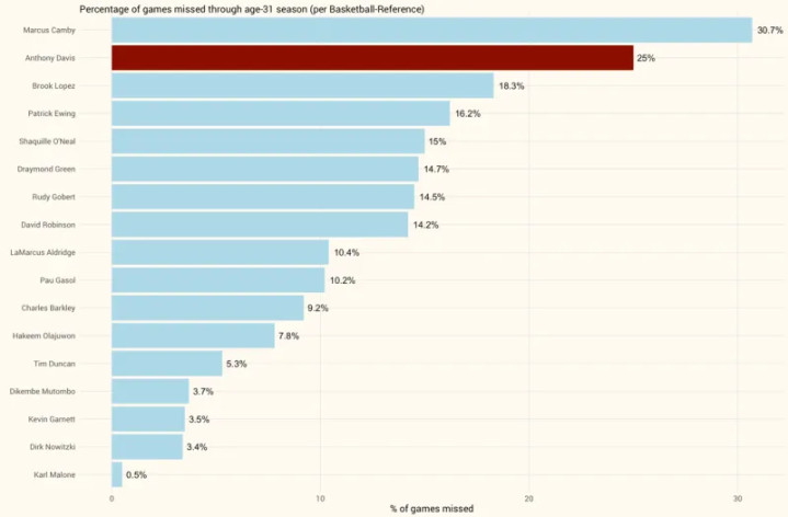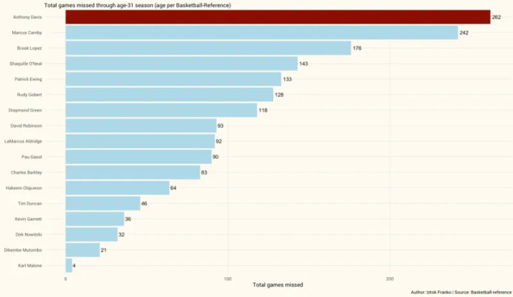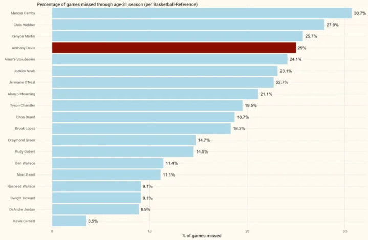 戴维斯职业生涯的缺阵情况确实位居这些大个子中的前列,数据上接近于阿玛雷·斯塔德迈尔、肯扬·马丁和克里斯·韦伯等球员。这些球员的巅峰期,某些情况下甚至是整个职业生涯,都因源源不断的伤病侵袭而被迫缩短。但在与斯托茨交流并深入研究伤病数据库后,我认为戴维斯仍保有希望,那便是他所遭遇的伤病类型。