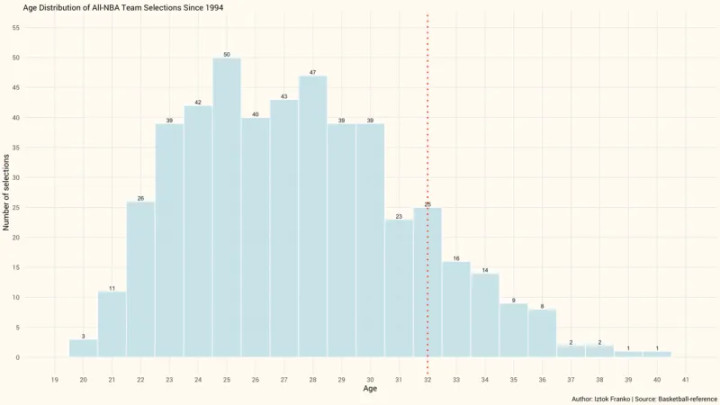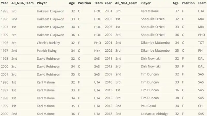 因而自1994年以来,实际上仅11名大个子球员在32岁或以上年龄入选过最佳阵容。若细究,这些入选大多发生在1990年代和2000年代,那是当今更快节奏、注重空间的时代之前,由身体对抗型大个子主导的时期。