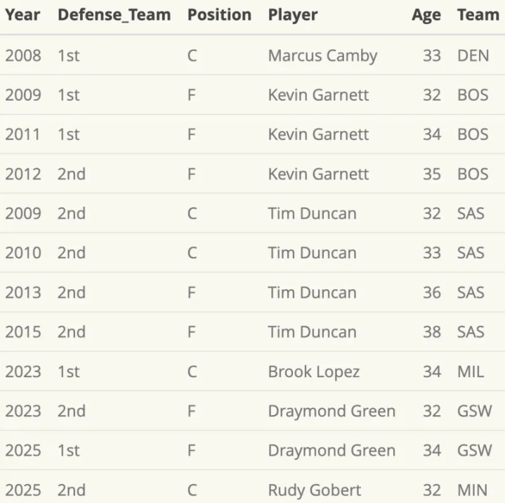 通过将范围扩展至最佳防守阵容,又有五名球员加入32岁后仍保有高影响力赛季的名单:马库斯·坎比、凯文·加内特、布鲁克·洛佩兹、德雷蒙德·格林和鲁迪·戈贝尔。
