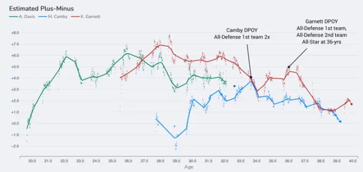 我并非在这里预言戴维斯将完全重走这样一条路径。但关键在于,历史上确实存在先例,一个频受伤病困扰的运动型防守核心,可以在职业生涯后期改写叙事。当然,两人之间还是有一个重大区别:当戴维斯进入32-33岁赛季时,他已经比同期的坎比多打了整整三个赛季、241场比赛以及近11000分钟。