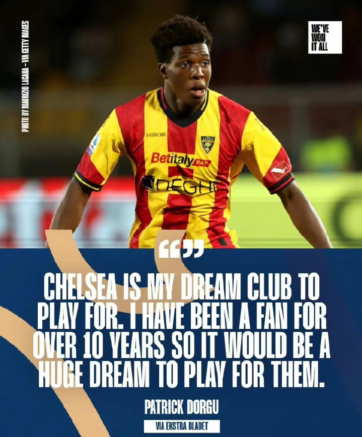 多古的职业生涯可谓一路风雨兼程。从刚进入莱切一线队的时候,他就愈发展现出了自己的天赋和实力。本赛季他已经踢了13场比赛,并且首发4次,令人称奇的是他在每一场比赛中都表现得非常出色。他的出色表现引起了无数豪门俱乐部的关注,但多古在最近的一次丹麦媒体采访中表示,他的心中一直钟情于切尔西。据悉,他已经关注这支伦敦的蓝军超过10年了。