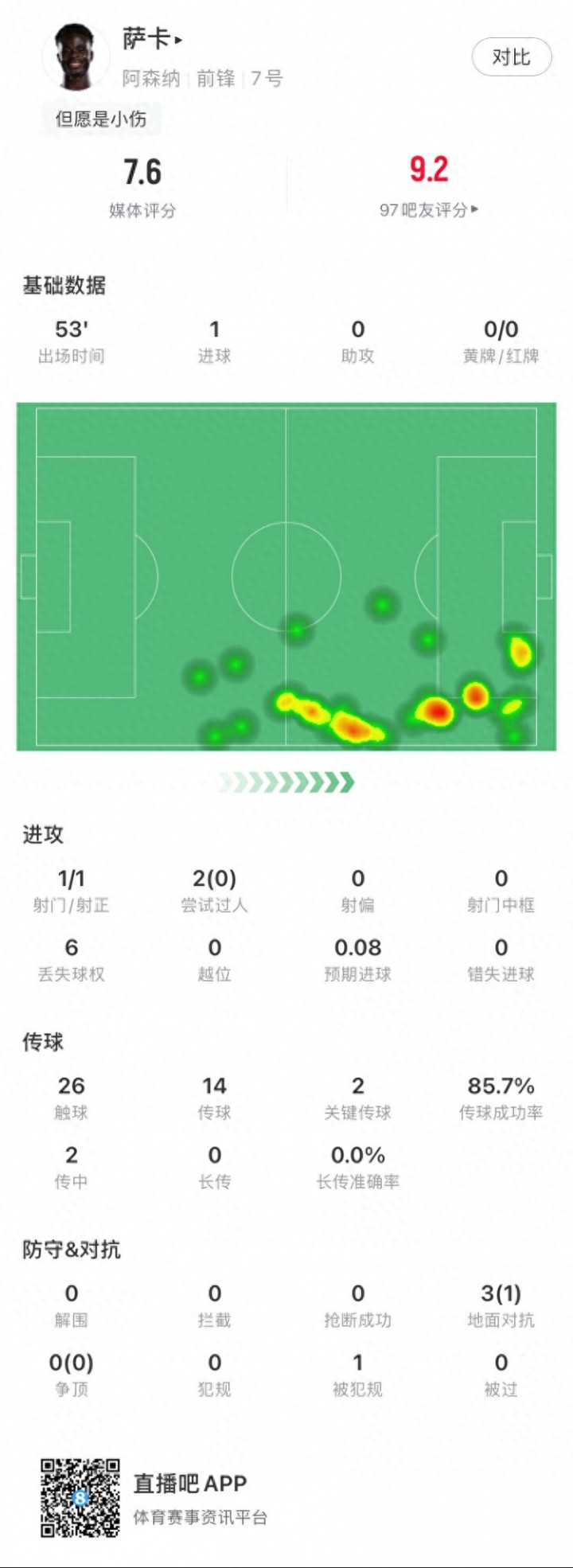愿无大碍! 萨卡本场数据: 1个进球, 26次触球, 2次关键传球
