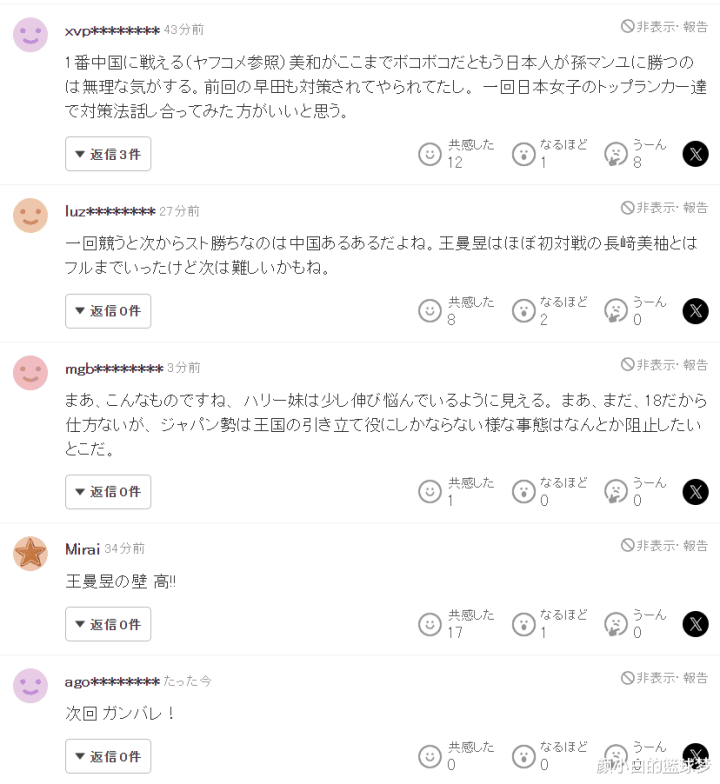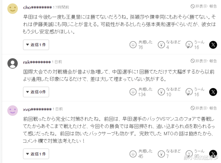2.真是惨败啊,老实说王曼昱选手肯定对日本选手很失望吧,对阵张本美和、早田希娜都还没有尽全力比赛就结束了。中国选手对日本选手都有针对性策略,但日本选手却没有什么好办法根本无法取胜,在训练中日本也没有可以模仿孙颖莎、王曼昱选手打法的球员;