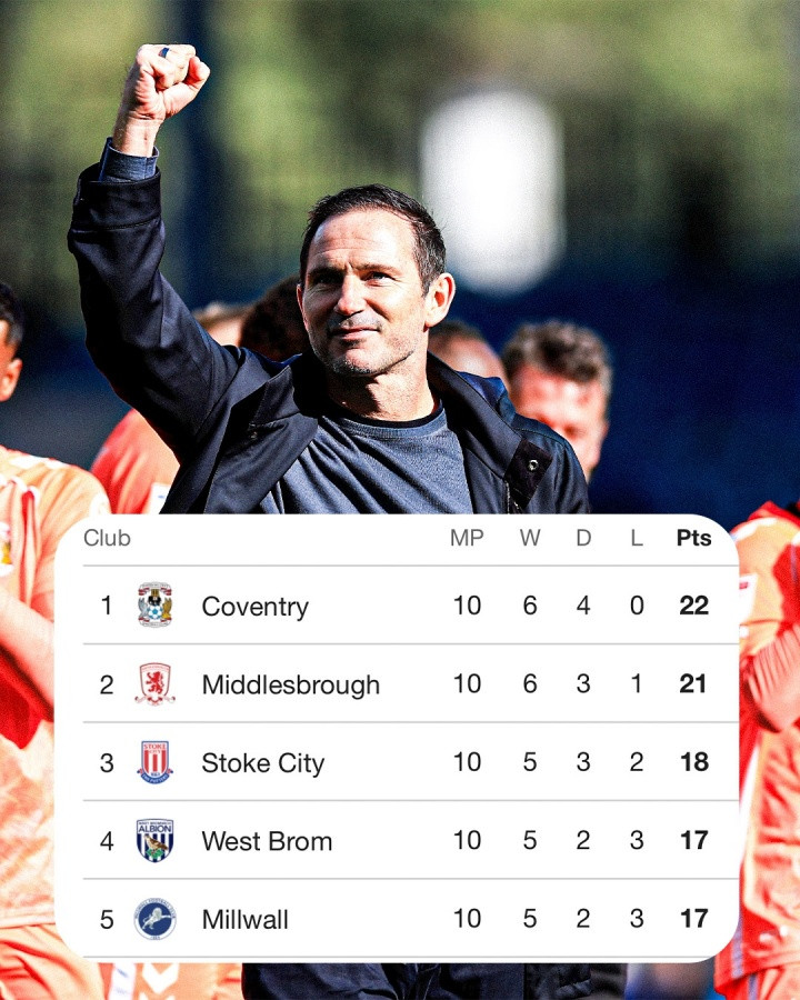 兰帕德的球队近4场比赛豪取4连胜且1球没丢,4场一共打入14球:3-0伯明翰、4-0米尔沃尔、5-0谢菲尔德星期三、2-0布莱克本。目前6胜4平的考文垂以22分力压米德尔斯堡,领跑英冠。