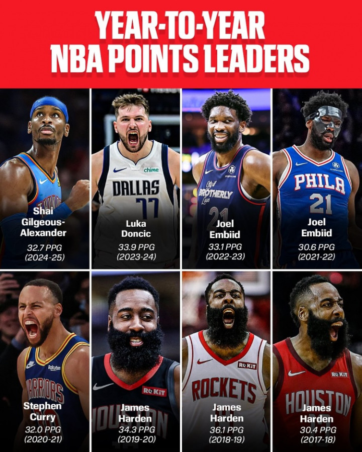 直播吧10月22日讯NBAONESPN统计,列出了NBA近16个赛季的NBA得分王,这16个赛季的得分王由八人包办。 详细名单: 2024-25:亚历山大32.7分 2023-24:东契奇33.9分 2022-23:恩比德33.1分 2021-22:恩比德30.6分 2020-21:库里32.0分 2019-20:哈登34.3分 2018-19:哈登36.1分 2017-18:哈登30.4分 2016-17:威少31.6分 2015-16:库里30.1分 2014-15:威少28.1分 201...