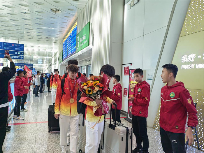 极目新闻记者徐颖 2025年11月13日下午,承载着湖北U20男足冠军队荣耀的航班,降落在武汉天河国际机场T3航站楼。当日的航站楼出口通道早已被喜庆氛围包裹,湖北足球青训梯队队员身着统一服装,分列通道两侧,手持鲜花与横幅静候。 11月12日晚,2025全运会男足U20组决赛上演巅峰对决。湖北队在0-1落后的不利局面下,于第90分钟顽强扳平比分,将比赛拖入点球大战。最终,湖北队五罚全中,广东队则在第三轮罚失点球,湖北队以6-4的总比分战胜对手,成功捧起冠军奖杯——创下了湖北足球历史最佳战绩。 “...