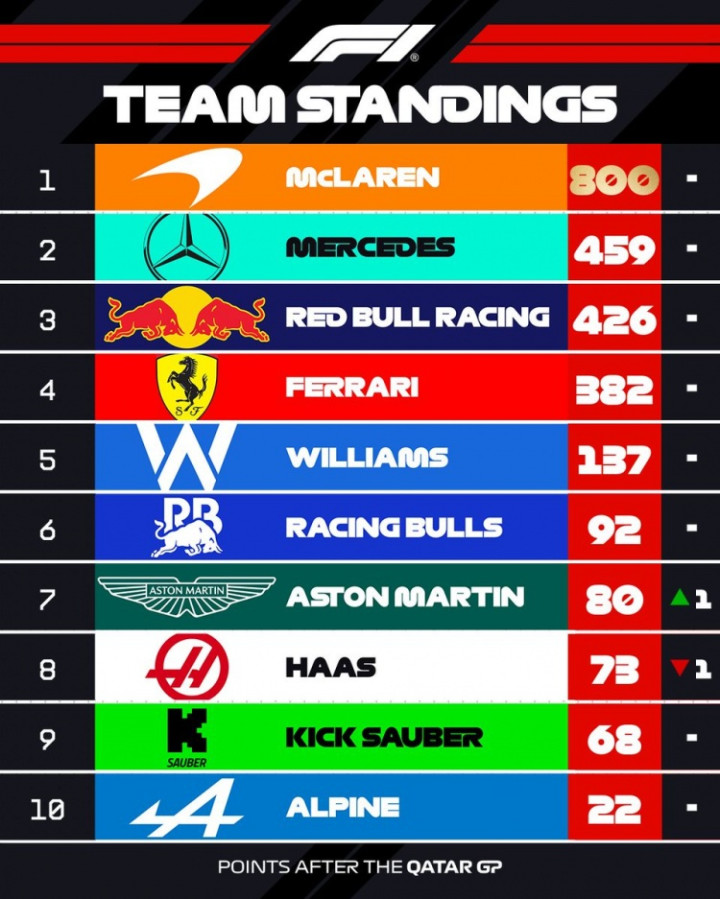直播吧12月1日讯F1卡塔尔大奖赛尘埃落定,F1的2025年赛季已经来到最后一站,以下是全年车队积分榜,目前第二和第三名仍然有悬念。 1.迈凯伦800分 2.梅赛德斯459分 3.红牛426分 4.法拉利382分 5.威廉姆斯137分 6.小红牛92分 7.阿斯顿马丁80分 8.哈斯73分 9.索伯68分 10.Alpine22分...